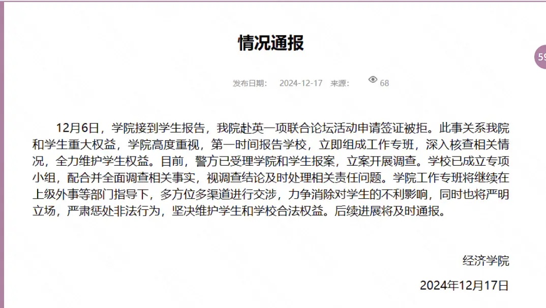 12月17日下昼,浙江大学经济学院发布情况通报称,学院赴英一项团论断坛手脚请求签证被拒一事已树立责任专班,核查关系情况,现在,警方已受理学院和学生报案,立案开展访问。